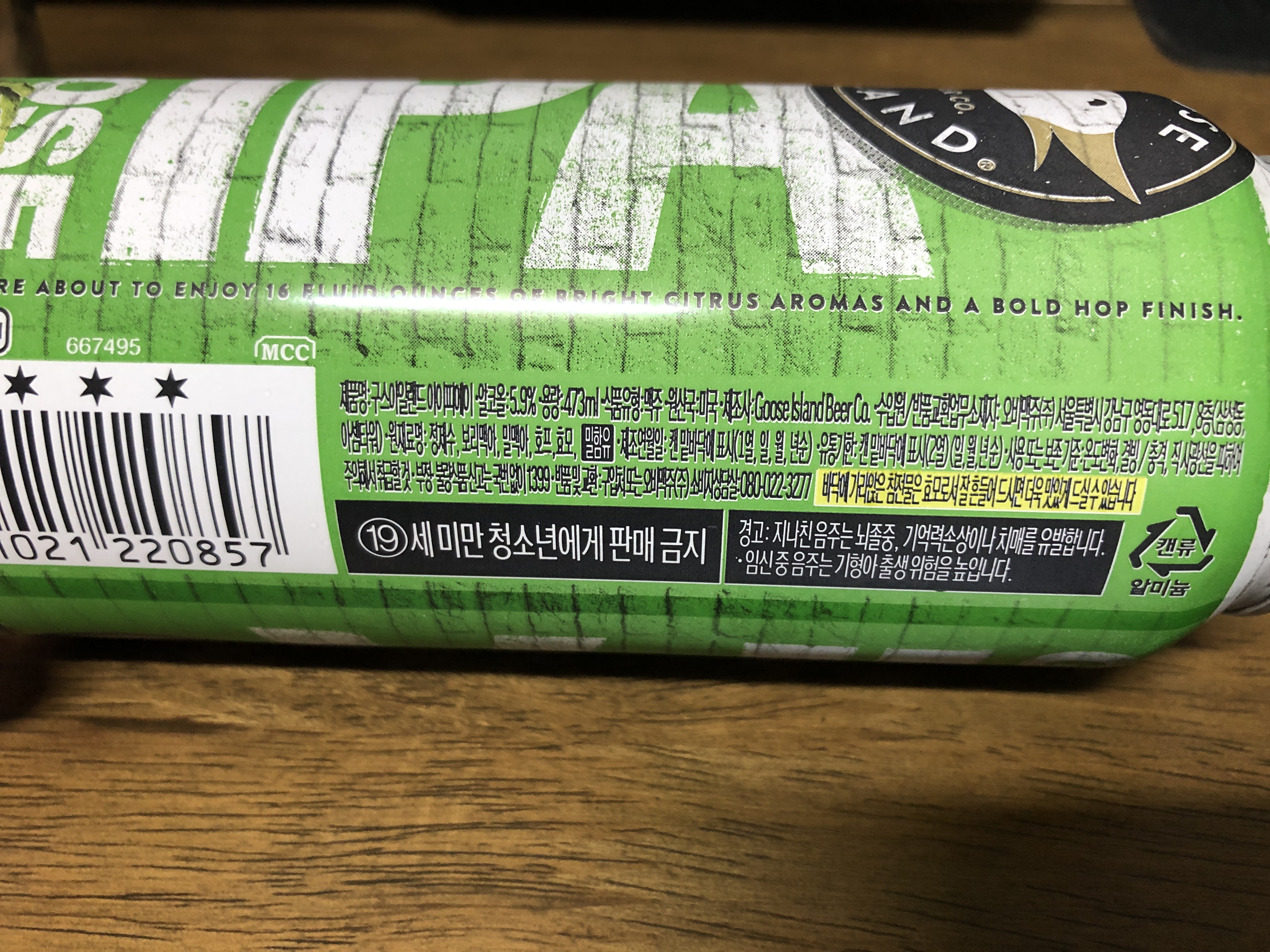 구스아일랜드 IPA는 알콜 도수가 5.9%로 생각보다 높네요. 밀맥주(4.2%)와 알콜 차이가 큽니다.