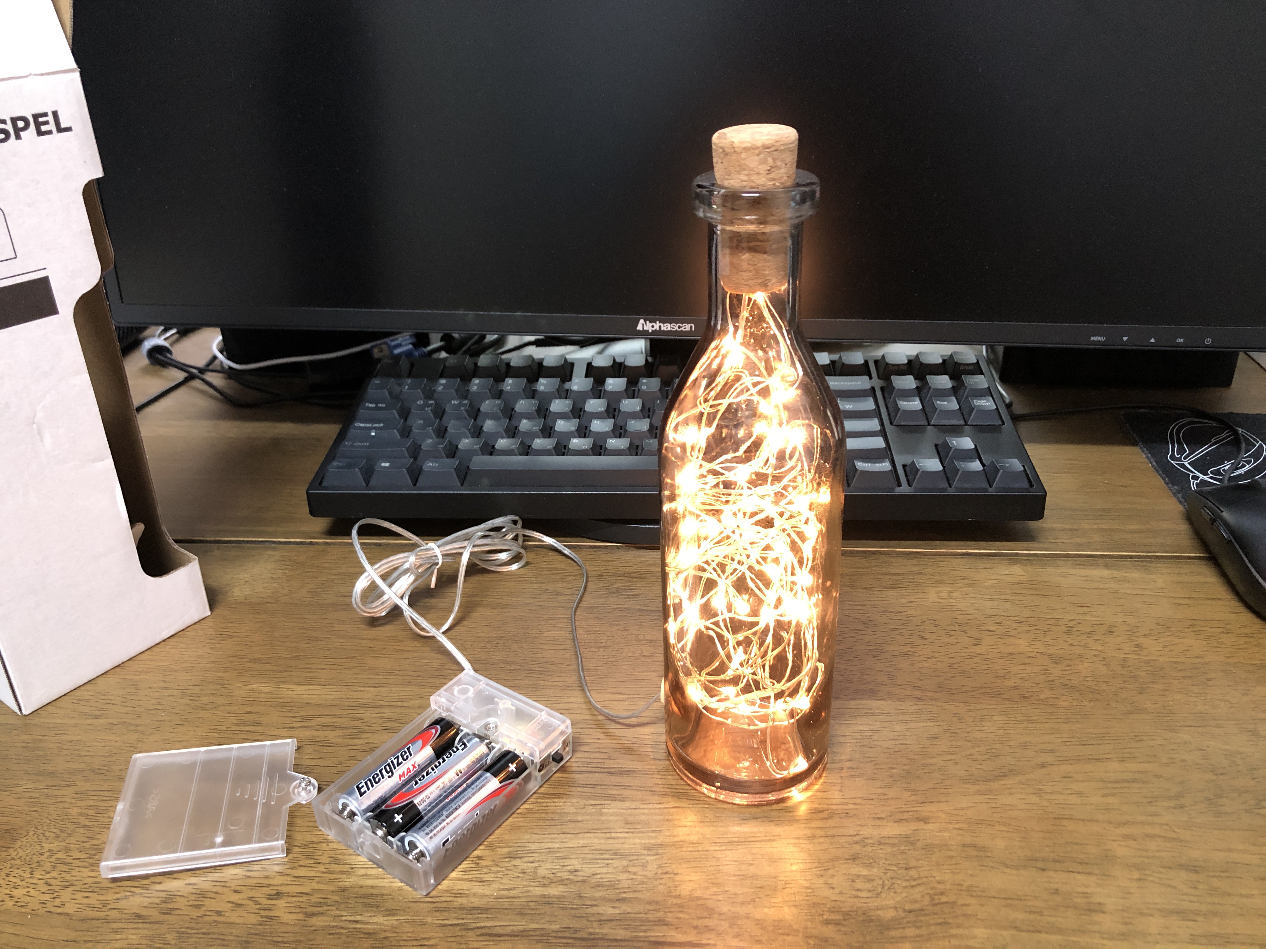 병안에 조명이 엉켜 들어있는 것을 볼 수 있습니다. 유리병의 마감처리는 아주 우수한 편은 아닙니다. 표면에 경계 흔적이 보이는데 이 문제는 병을 장식할 때 안보이게 잘 돌려서 놓으면 됩니다. 크게 신경쓸 정도는 아니지만 혹시 민감한 사람이면 잘 보고 구매하세요.