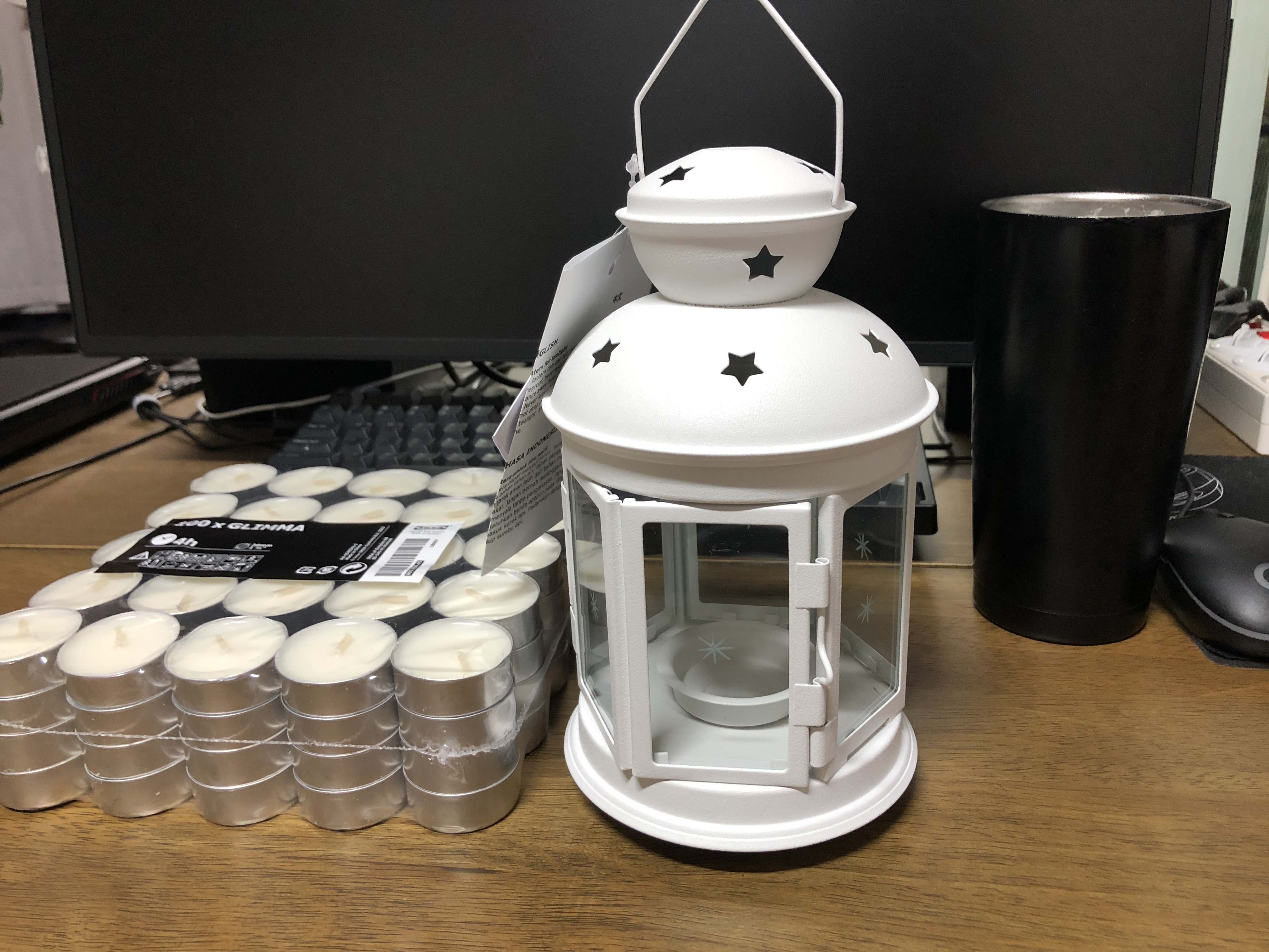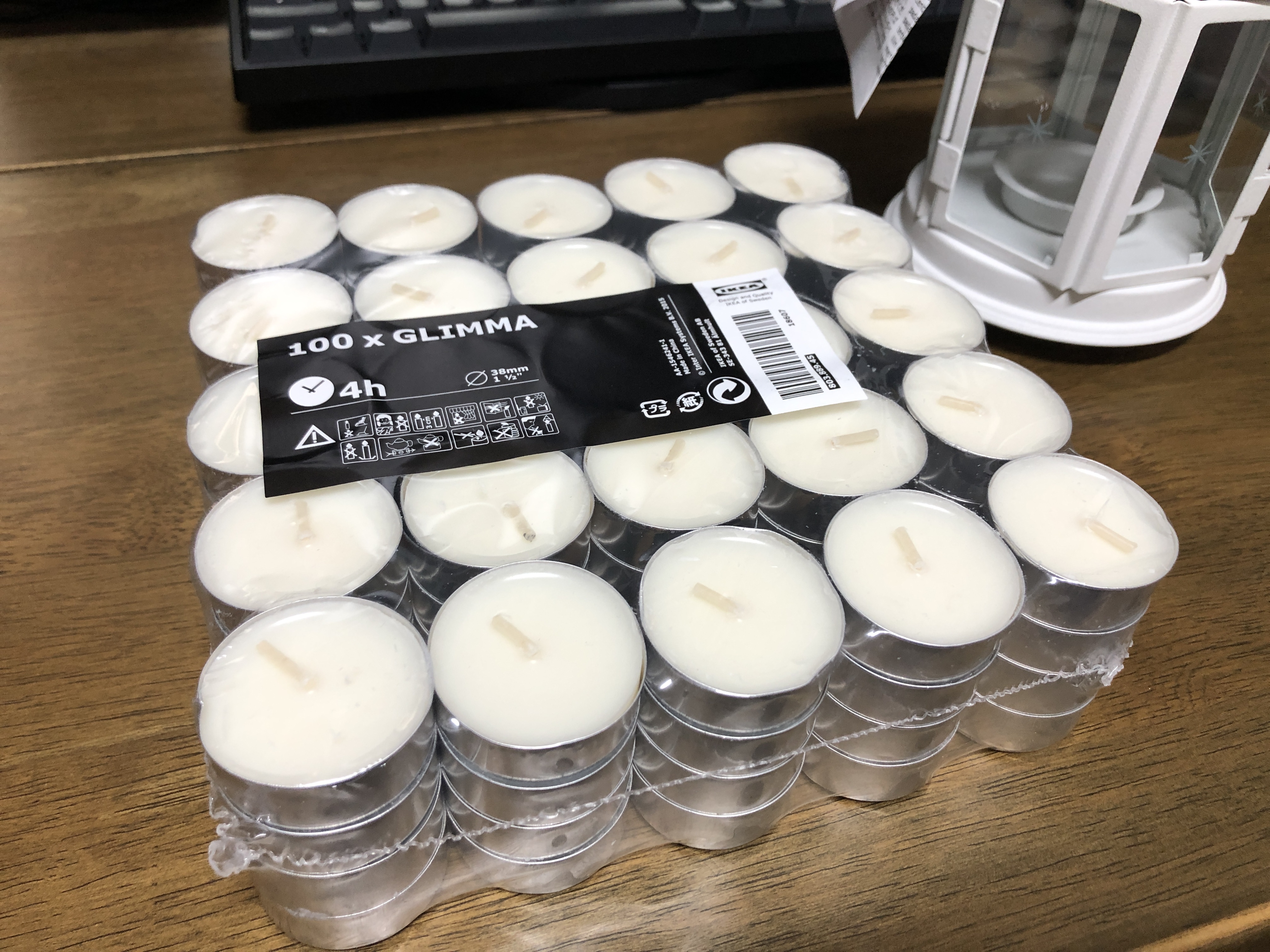 ROTERA 로테라 미니 양초 랜턴과 이케아에서 함께 구매한 GLIMMA 미니 양초입니다. 100개에 4500원입니다. 미니 양초 1개에 45원으로 4시간 정도 사용할 수 있습니다.