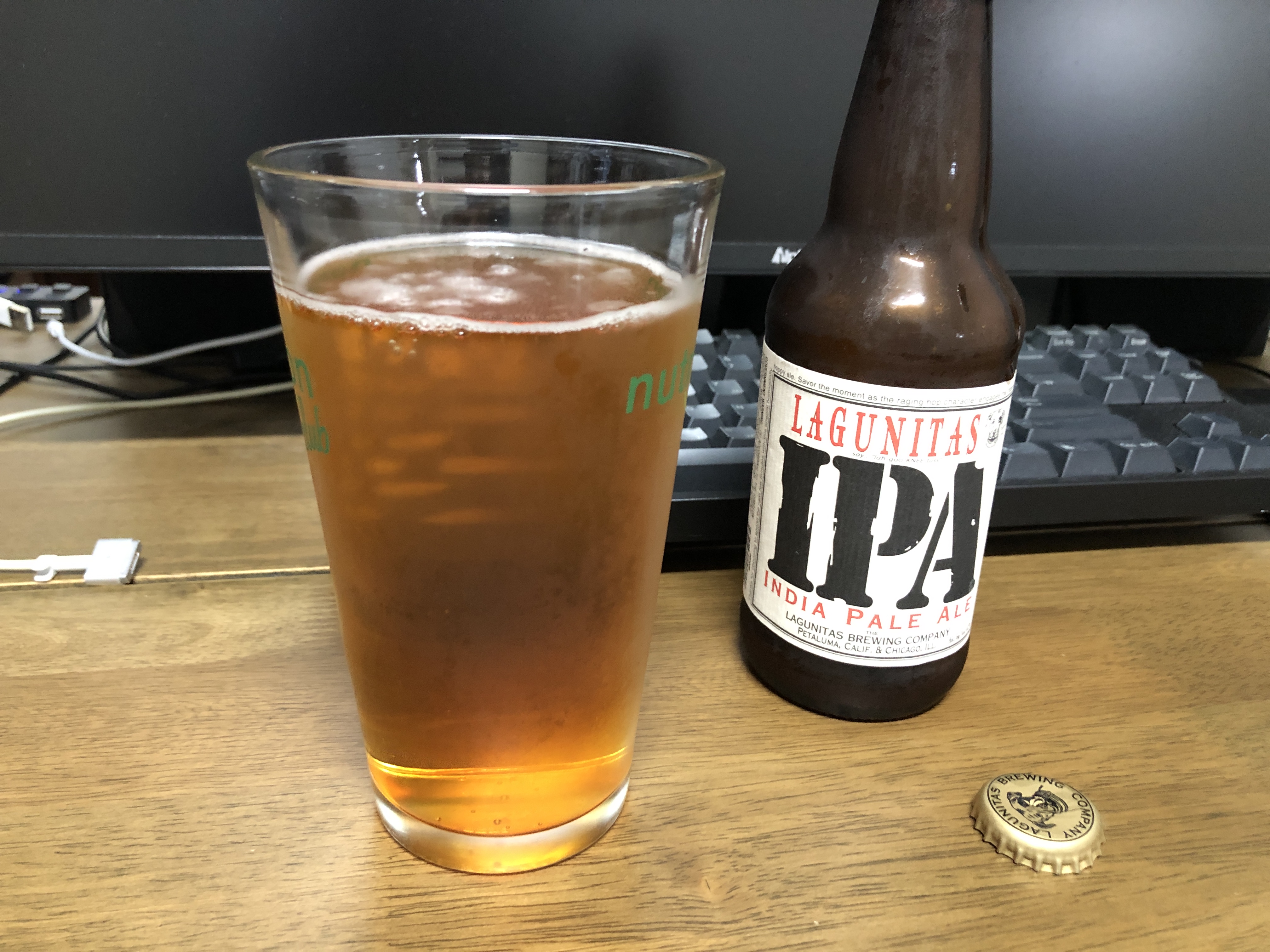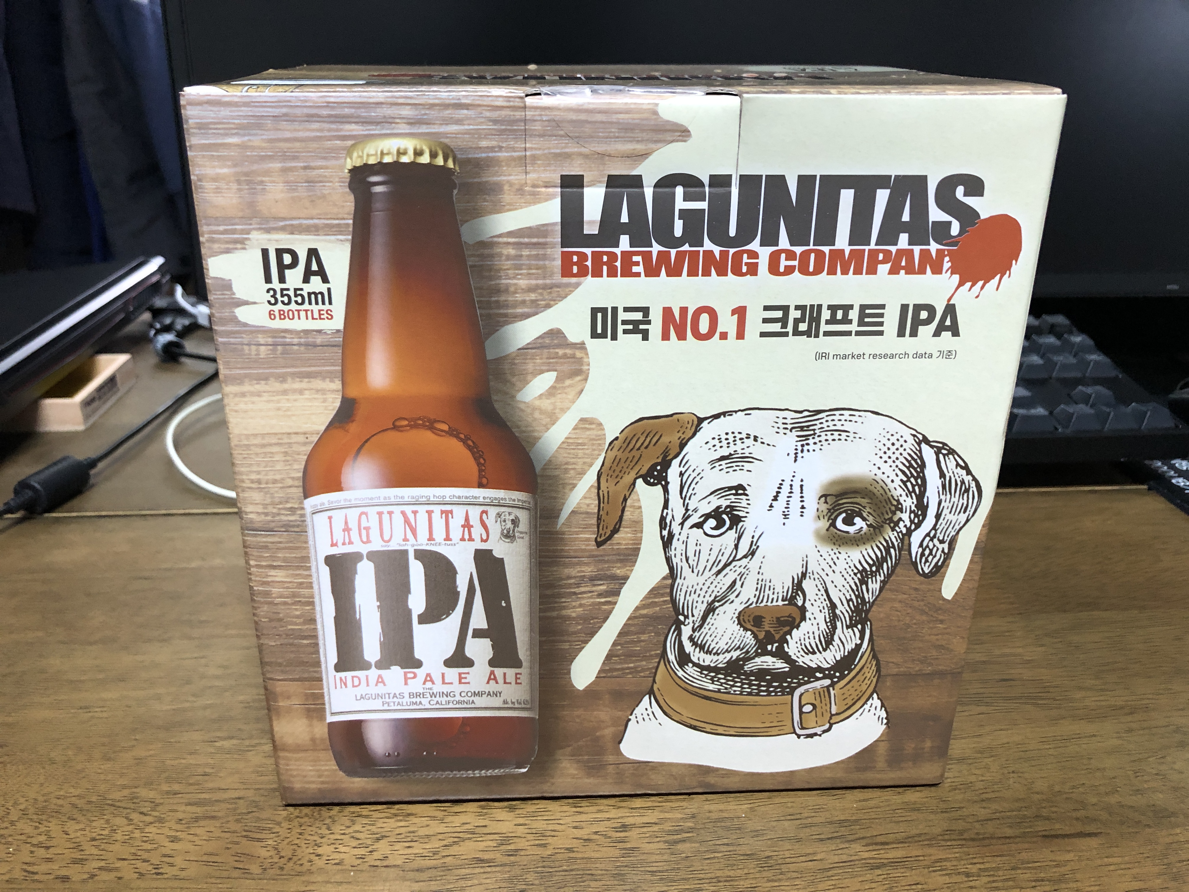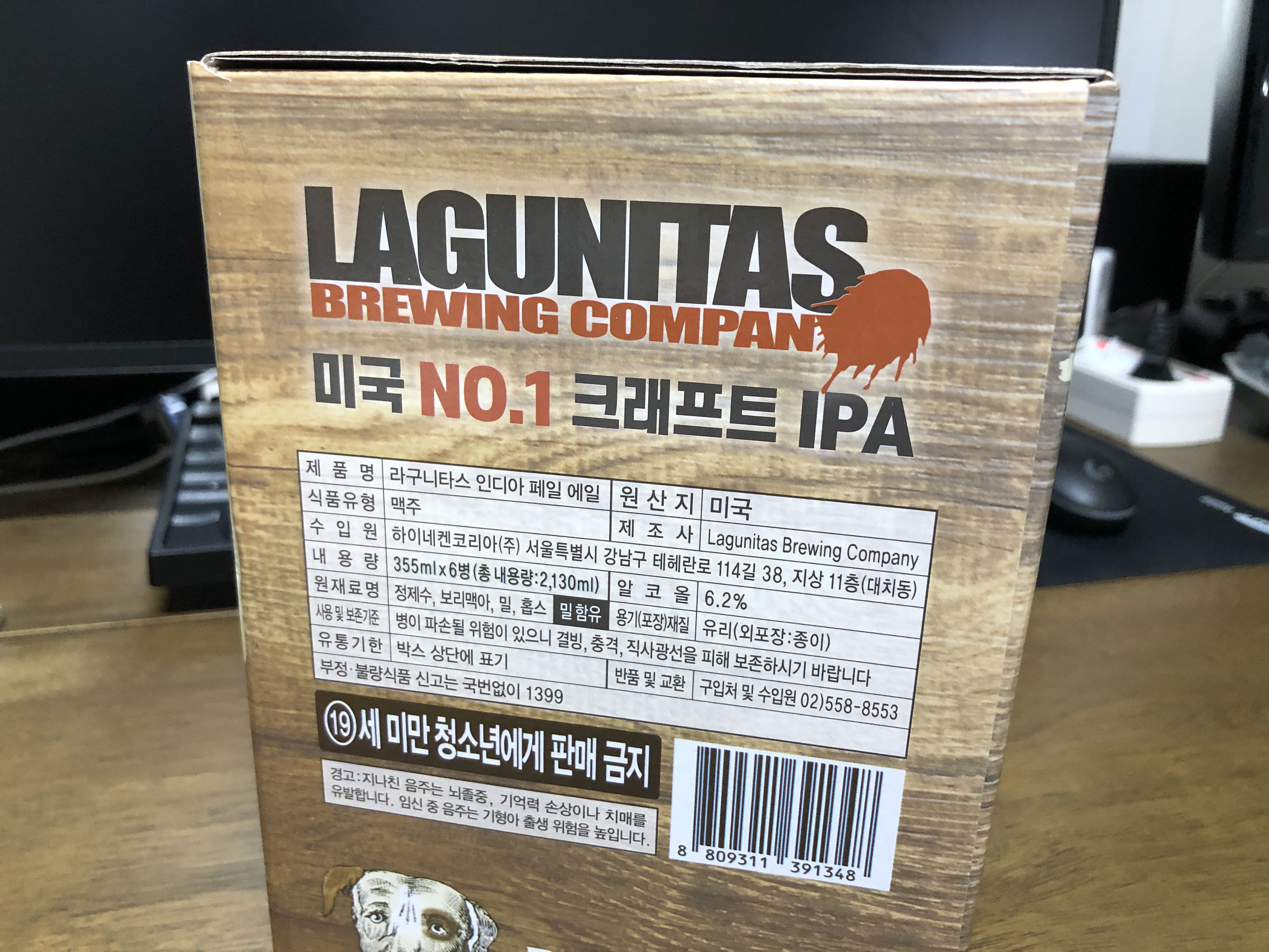 LAGUNITAS 라구니타스 인디아 페일 에일. 미국 NO.1 크래프트 IPA라고 광고를 합니다. 인디아 페일 에일 줄여서 IPA라고 말하는데 홉을 많이 넣어 쓴맛이 강한 게 특징입니다.