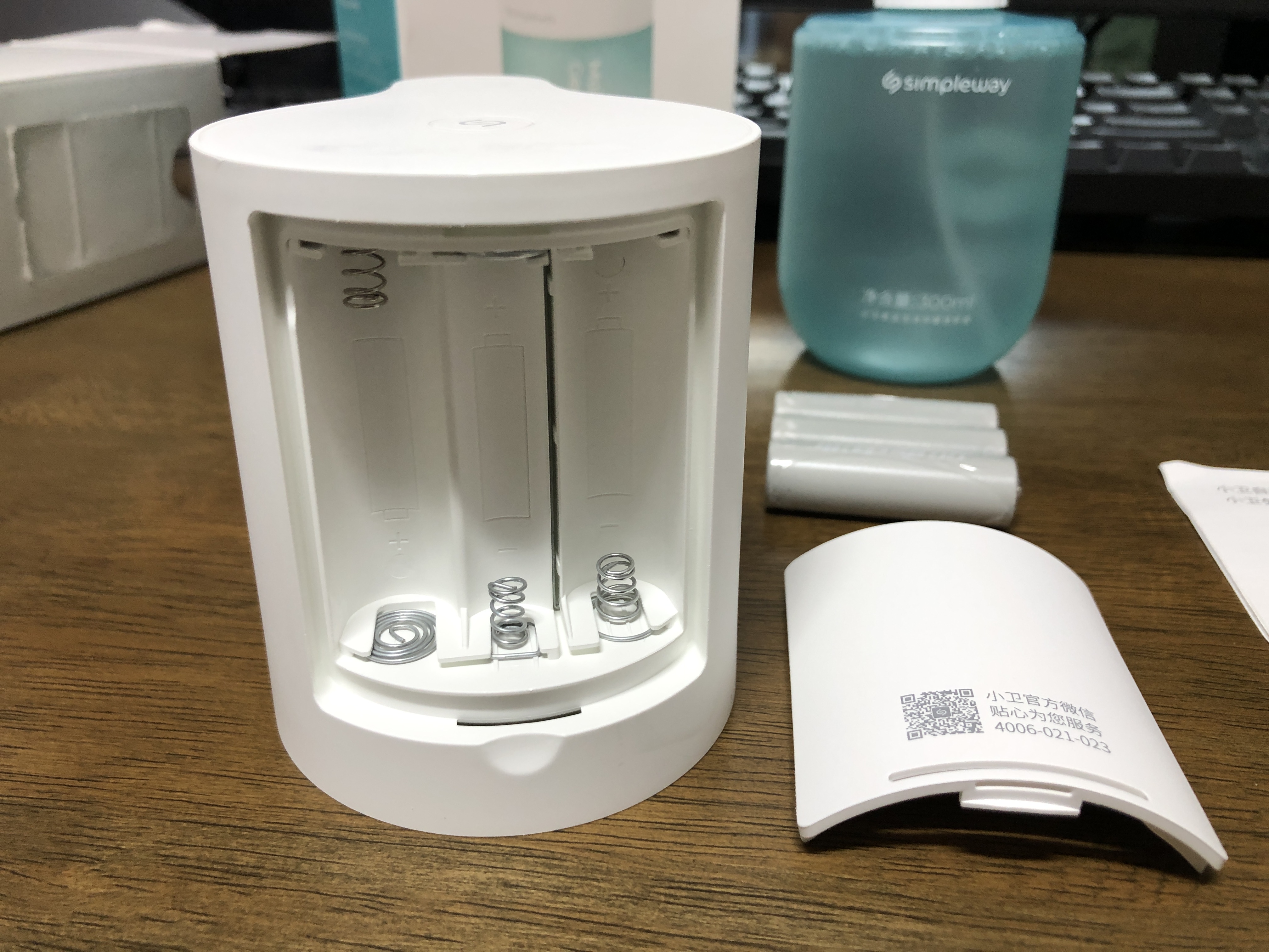 샤오미 simpleway 자동 손세정기에 배터리를 넣은 모습