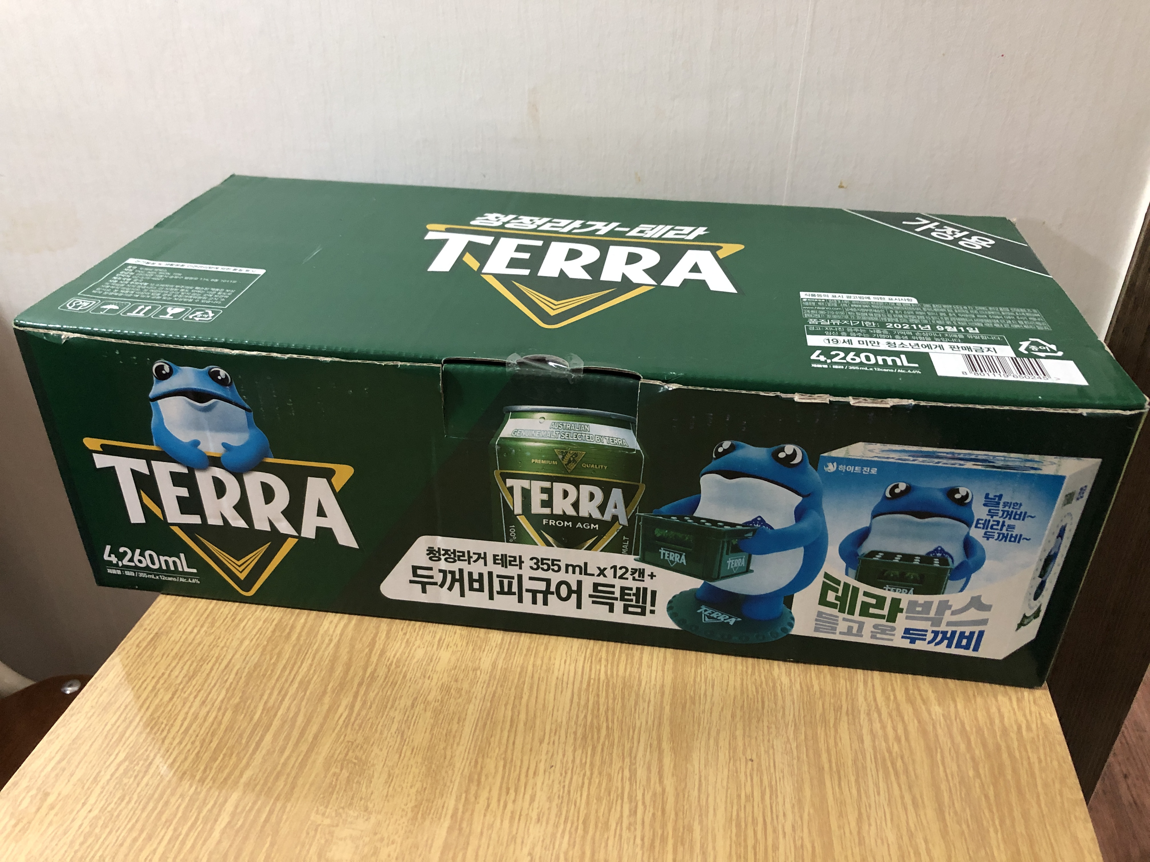 열어보면 355ml 테라 맥주 12캔과 두꺼비 피규어가 들어있습니다.