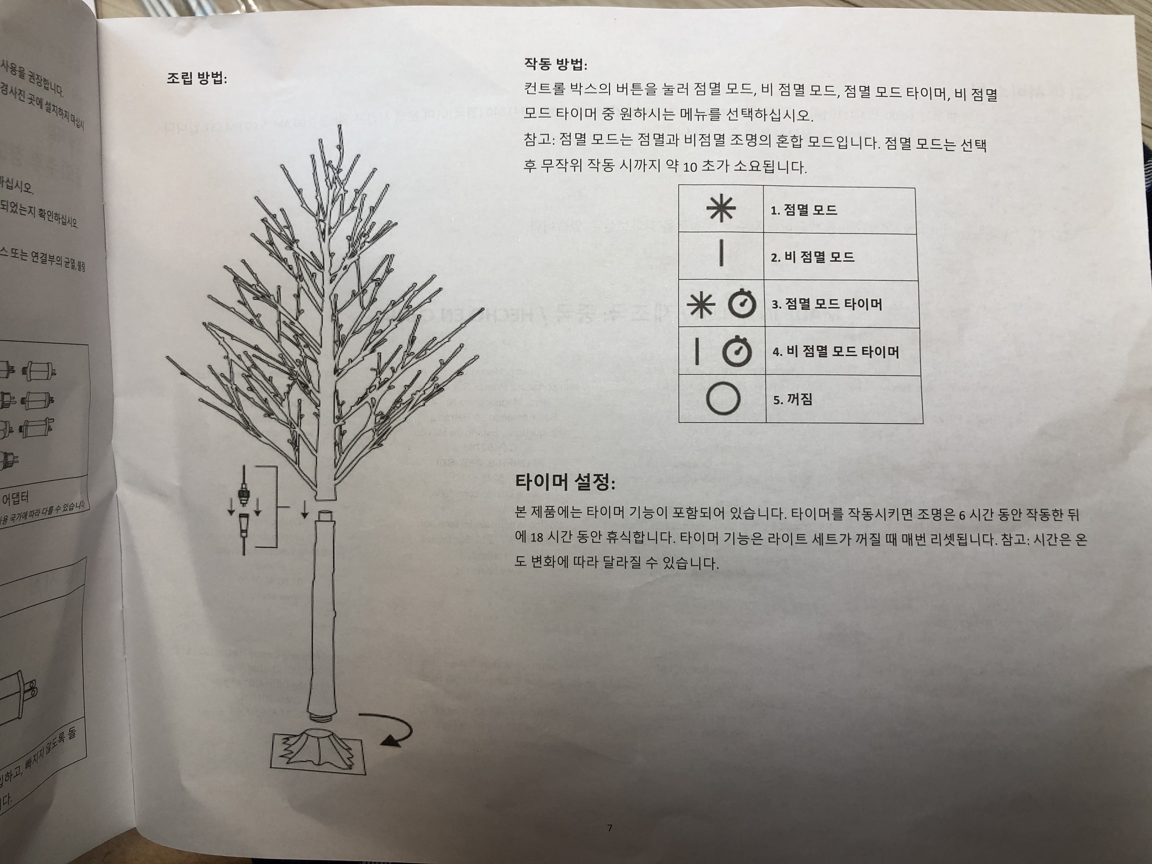조립 방법과 작동 방법이 매우 간단해 설명서 없이도 설치하고 사용할 수 있습니다. 모드는 점멸 모드와 비점멸 모드가 있고 타이머를 설정하면 6시간 작동 후 18시간 동안 휴식하는 구조입니다. 저는 직접 켜고 꺼서 한 번도 타이머 기능을 안 써봤네요. 코스트코 자작나무 트리는 실내는 물론 야외에서도 쓸 수 있는 제품입니다. 야외에서 쓸 때는 타이머 기능이 많이 유용할 것 같습니다.