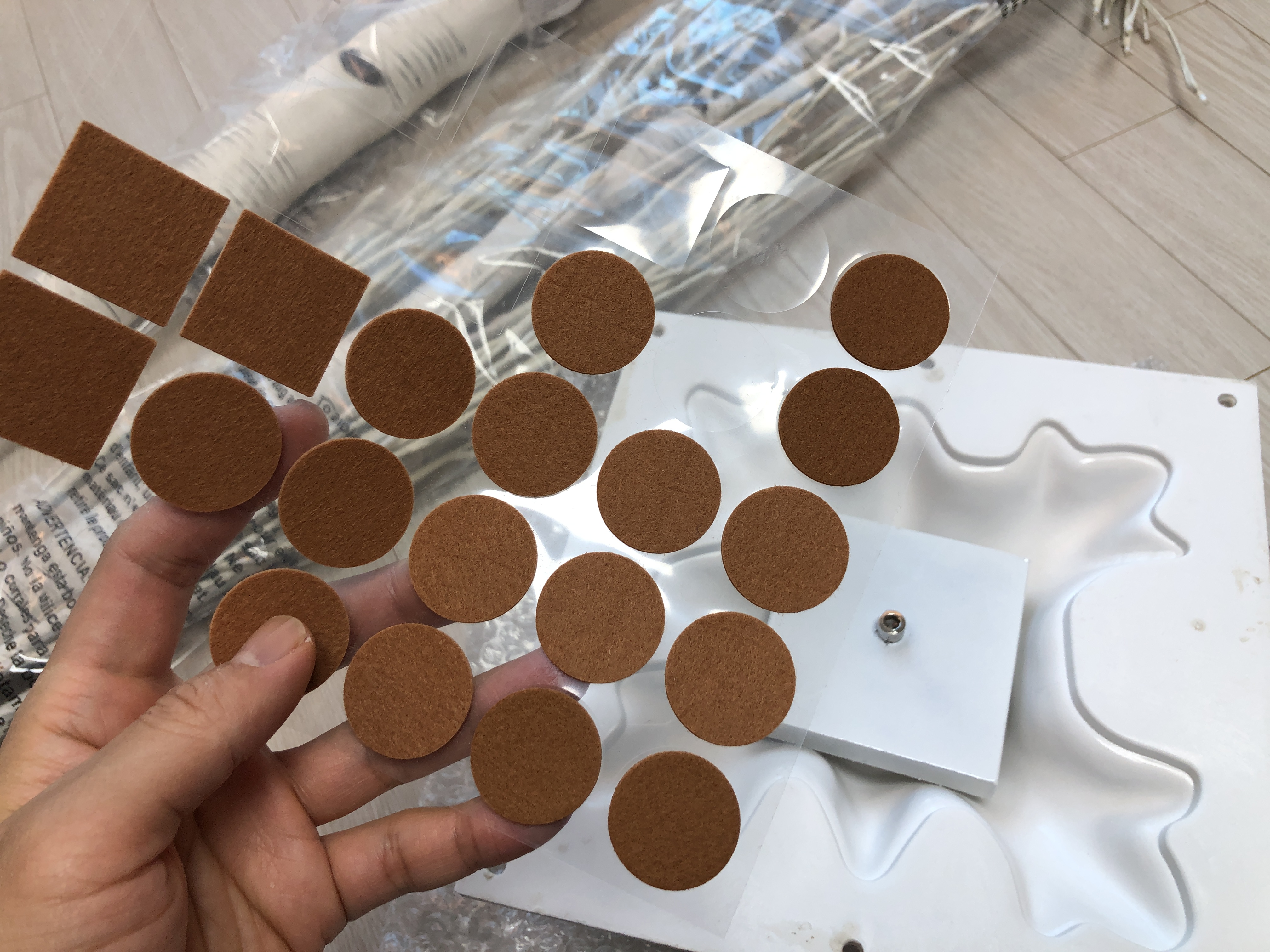 트리 받침대 바닥 마감상태가 별로라 바닥보호 부직포를 여러 개 붙였습니다. 부직포를 바르면 트리를 쉽게 밀어서 이동할 수 있어서 매우 편합니다.