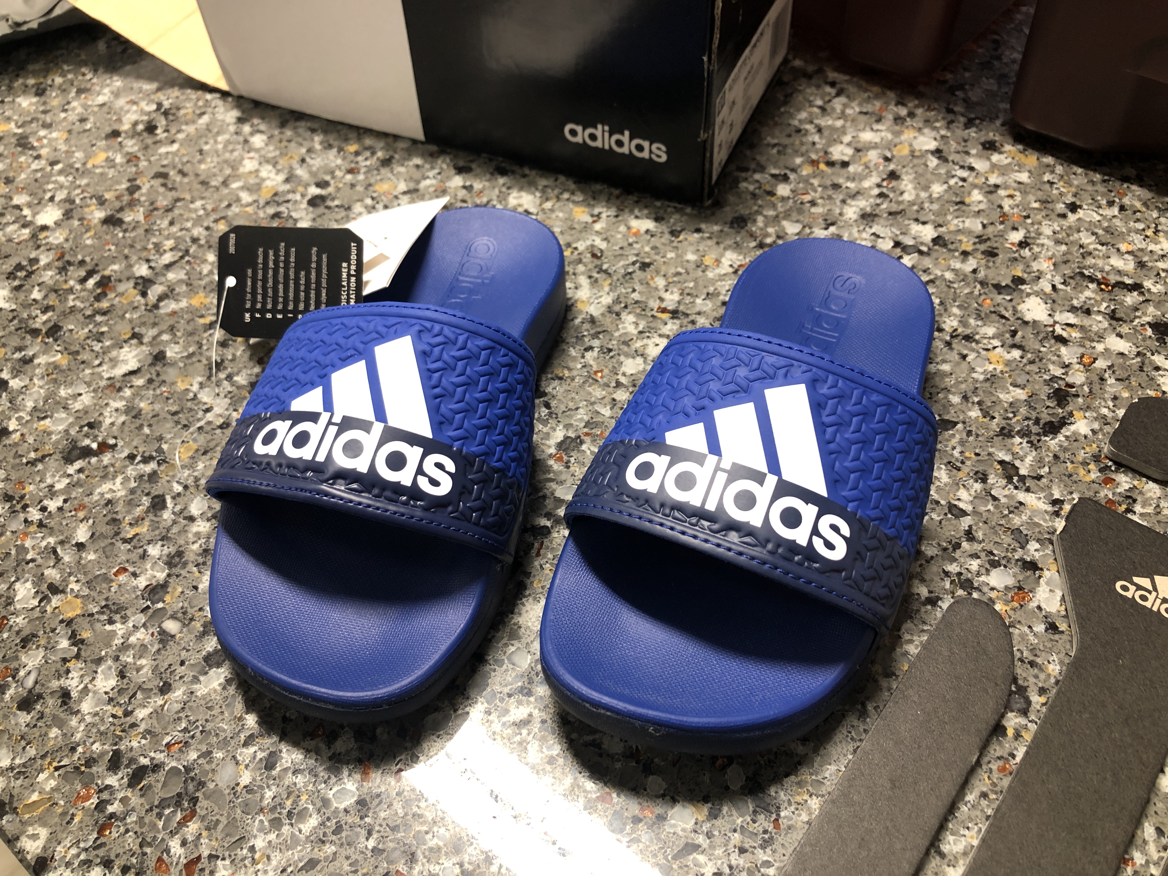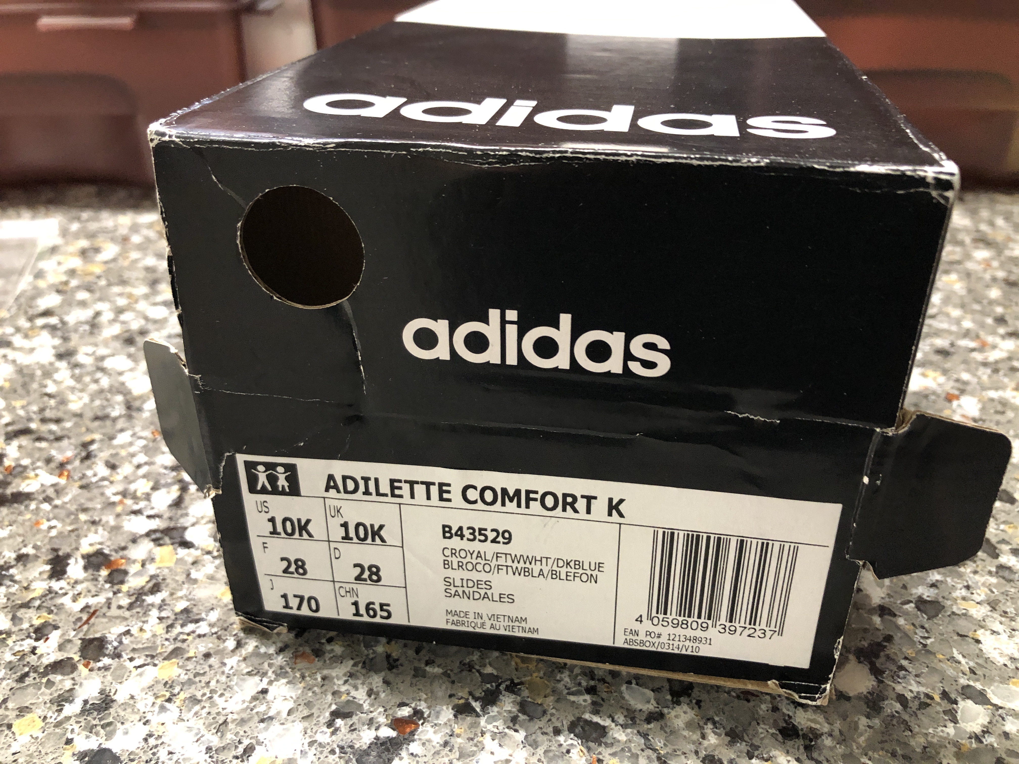 아디다스 키즈 아딜렛 컴포트 K 슬리퍼를 구매했습니다. 170mm 사이즈 하나밖에 안 남아서 그런지 9000원 정도로 매우 저렴하게 살 수 있었습니다. 170mm 슬리퍼는 5세 아이한테는 좀 크고 7세가 신으니 딱 맞네요.