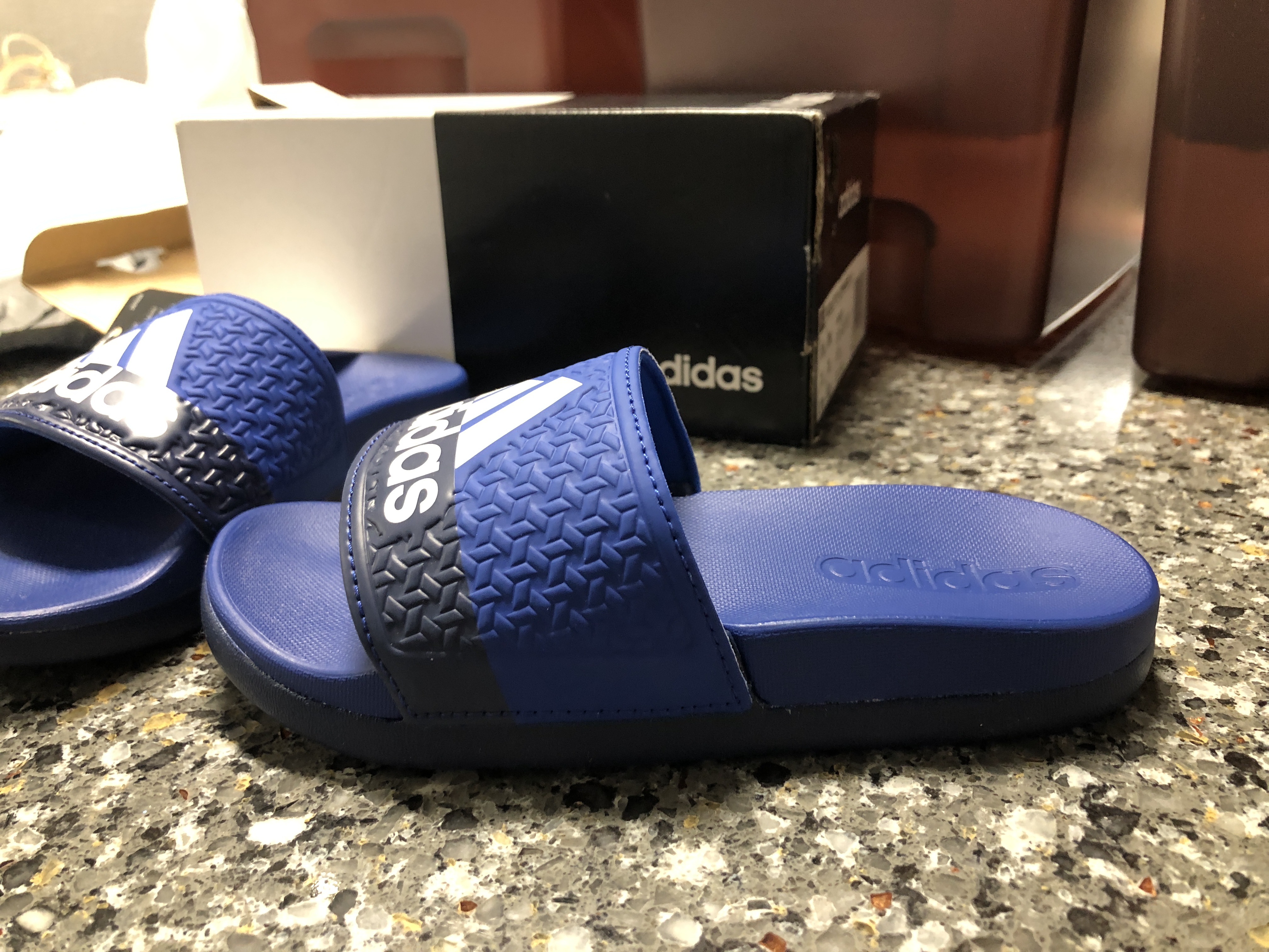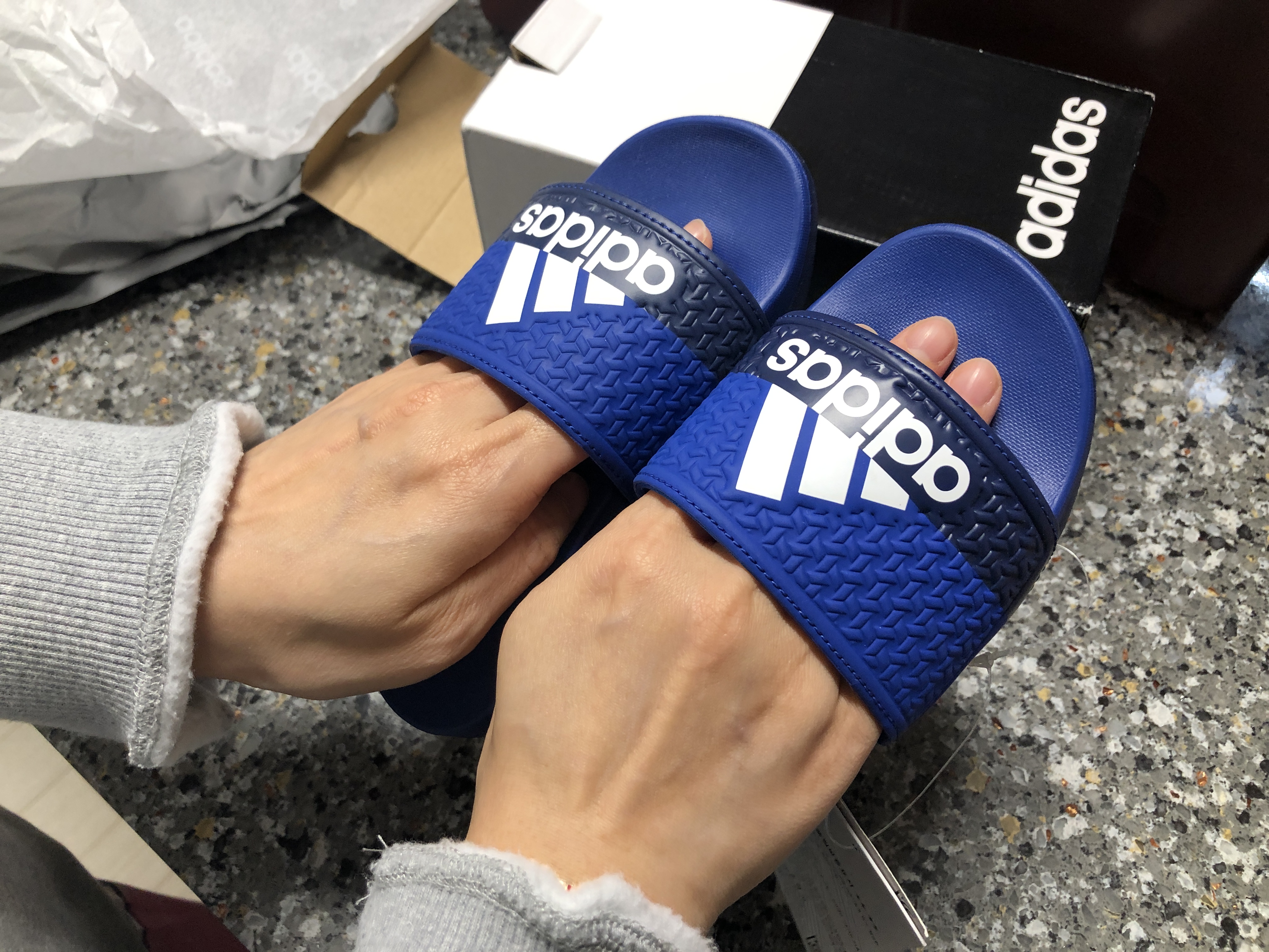 아디다스 키즈 아딜렛 컴포트 슬리퍼 중에서도 작은 170mm 사이즈라 그런지 꺼내는 순간 엄청 귀엽다는 생각을 했습니다. 물론 아디다스라 마감처리도 깔끔합니다.